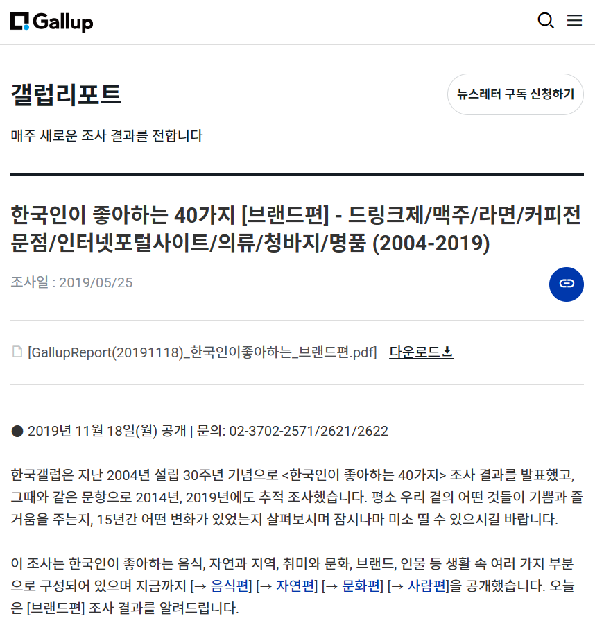 If you refer to "40 Things Koreans Like [Brand Edition] - Drinks/Beer/Ramen/Coffee Shops/Internet Portal Sites/Clothing/Jeans/Luxury Products (2004-2019)", cafes offer delicious and diverse coffee and beverages. You can see that many people prefer coffee as a drink that helps to recover from fatigue and change the mood. Next, Starbucks is the most popular among coffee shop brands, and it is said that they drink an average of 1.5 cups of coffee a day.