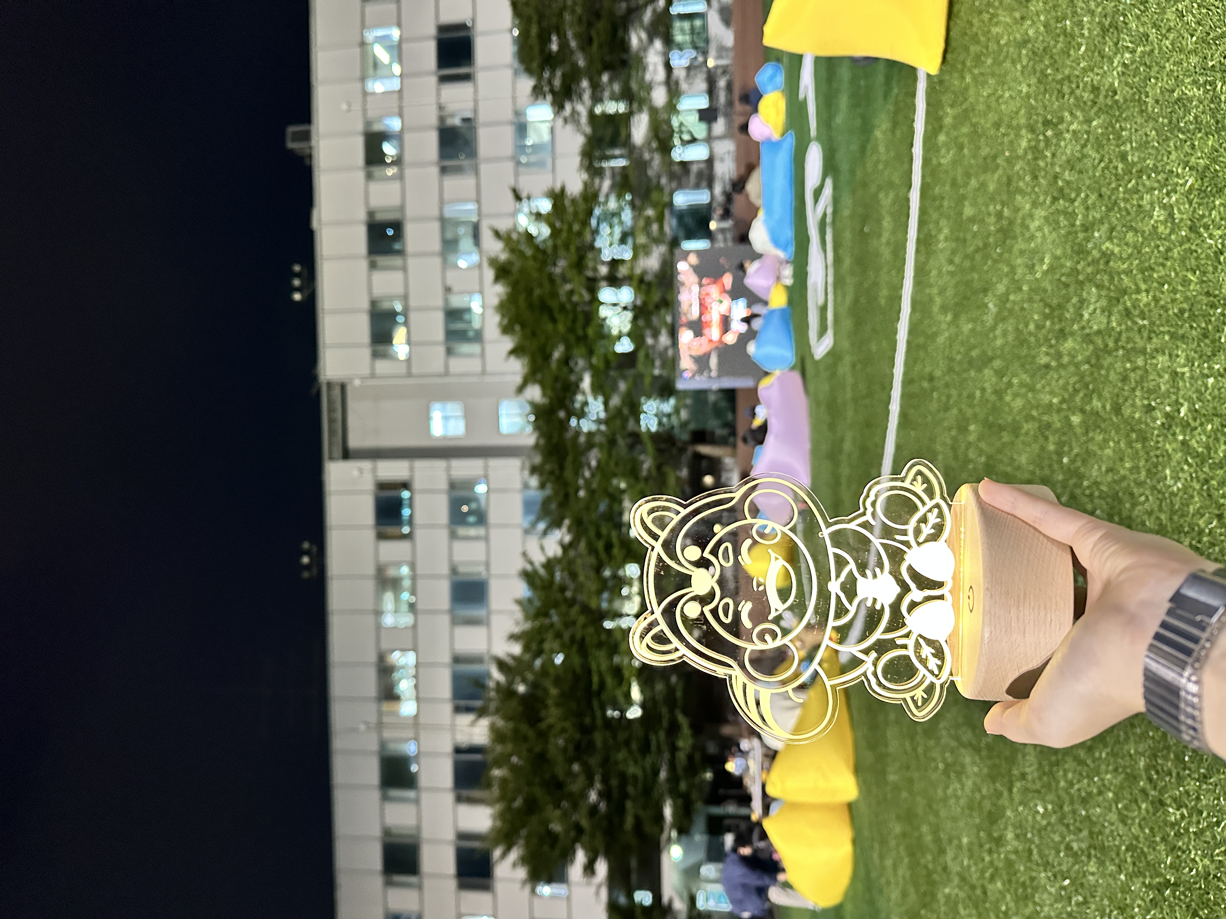 기대됐던 야간 영화제는 오후 6시 반부터 시작됐어요. 310관 앞 축구장 한쪽에 대형 스크린이 설치되었고, 잔디밭 위에는 노란색과 분홍색 빈백이 가지런히 놓여 있었어요. 저는 여유롭게 자리를 잡고 팝콘과 음료, 그리고 받은 푸앙이 무드등까지 켜서 준비 완료! ㅎㅎ 날씨가 정말 좋아서 누워만 있어도 너무 힐링이에요~!