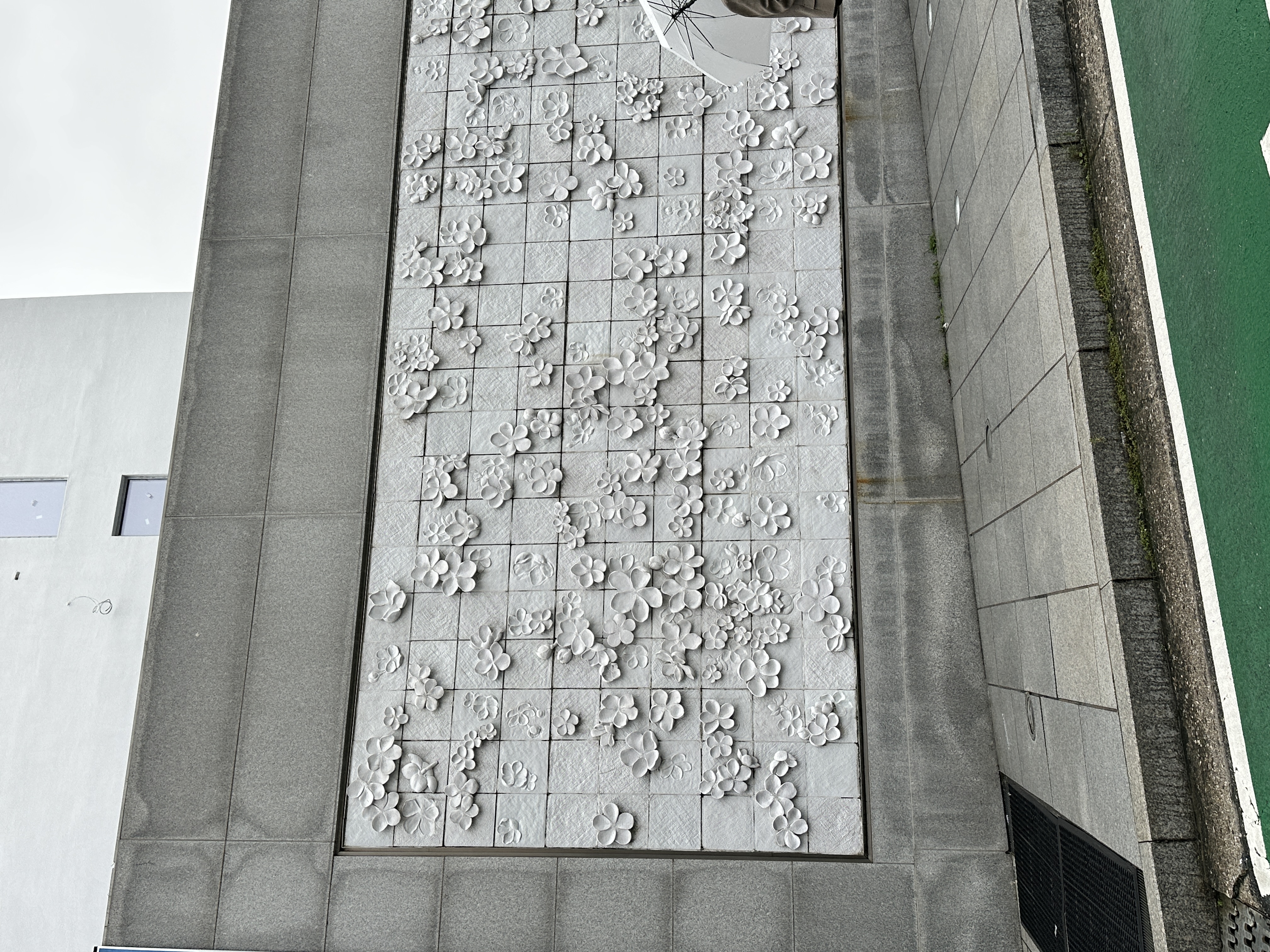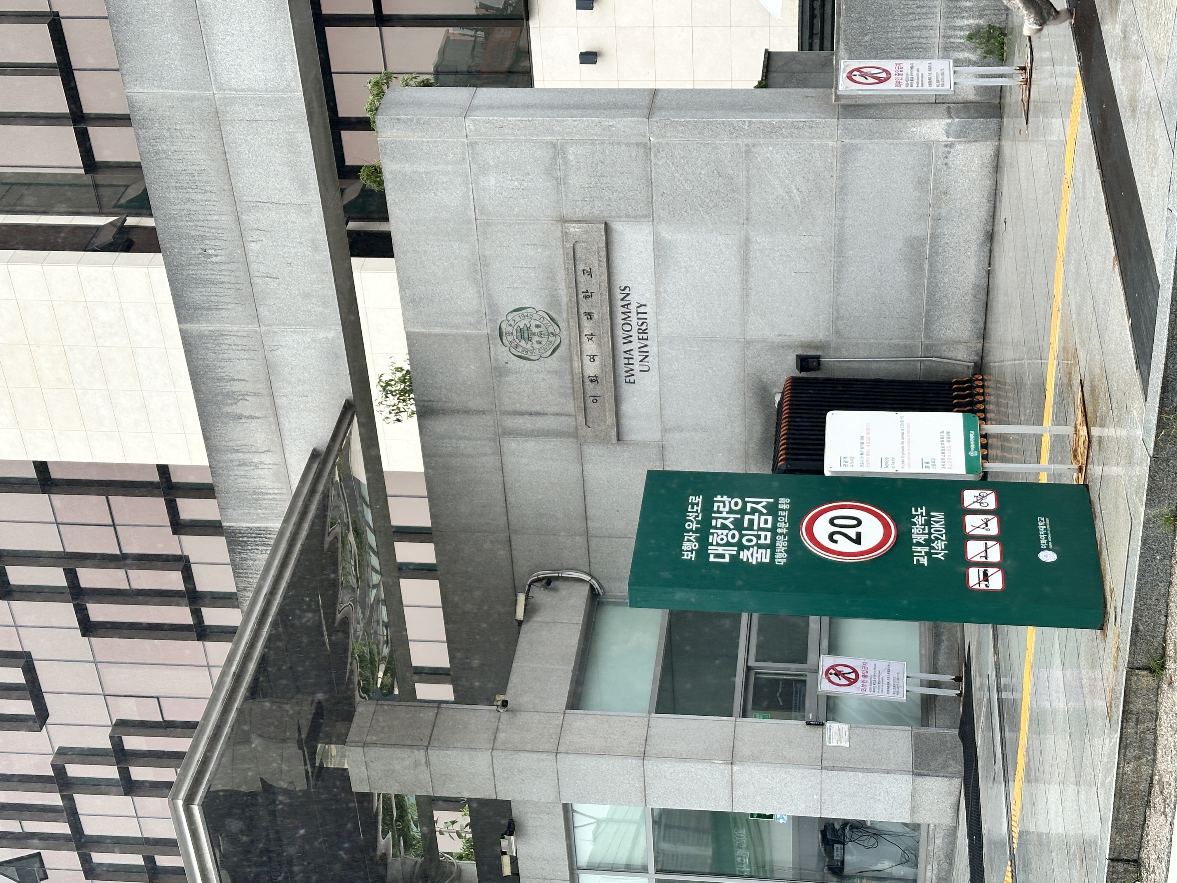 정문에 도착하자마자 웅장한 ‘EWHA WOMANS UNIVERSITY’ 간판이 반겨줬어요. 비 덕분인지 캠퍼스 분위기가 더 차분한 것 같아요. 비에 젖은 도로 위로 학생들과 관광객들이 우산을 쓰고 오가는 모습이 참 평화로웠어요. 정문 바로 옆 벽에는 흰색 꽃무늬 부조 벽화가 장식돼 있었는데, 너무 예뼜어요. 친구랑 앞에서 사진도 찍었어요ㅎㅎ 가까이서 보니 돌 위에 새겨진 꽃잎들이 하나하나 정성스럽게 조각되어 있었고, 이화의 상징인 ‘이화’를 형상화한 것 같았어요. 비가 내려서 그런지 벽면이 살짝 젖어 더욱 은은한 느낌이 나더라구요.